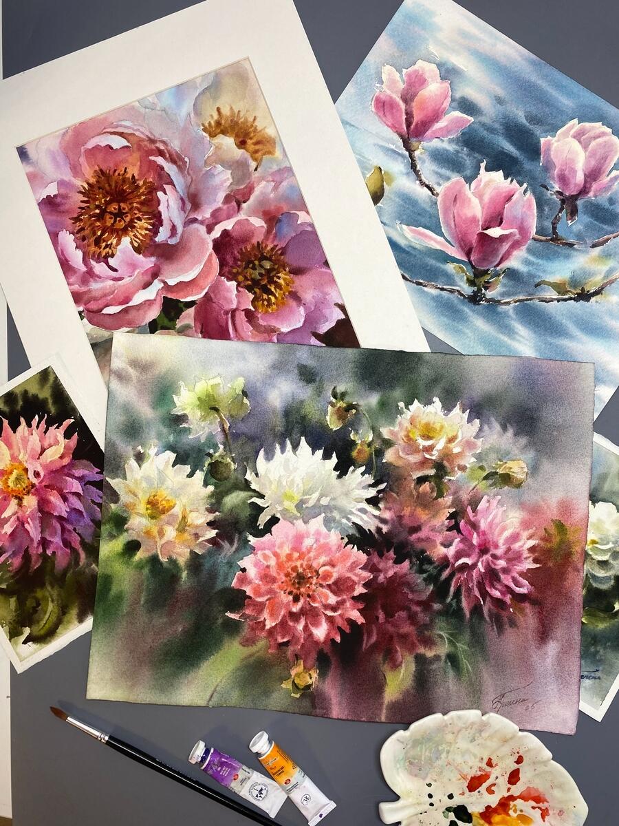 Курс состоит из 2-х подготовительных практических уроков по акварельным техникам + 8 цветочных мастер-классов.
