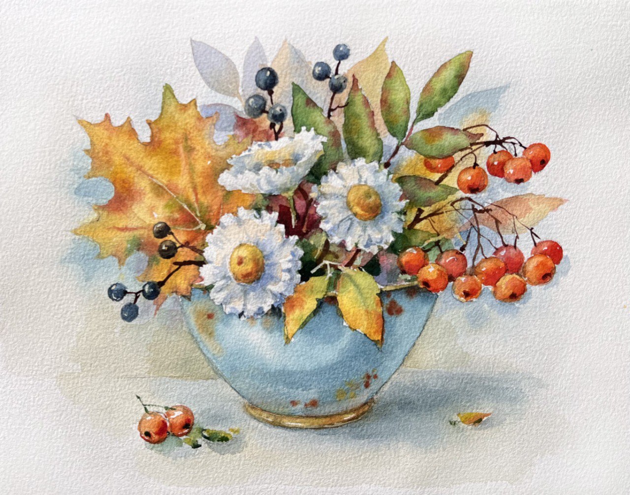 🌿На первом уроке: Выполним построение в карандаше, составляем гармоничную композицию из осенней листвы, рябины и белых хризантем.