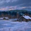 Атмосферный пейзаж зимнего вечера, когда в окнах зажигают свет и дым из трубы медленно стелется по воздуху.