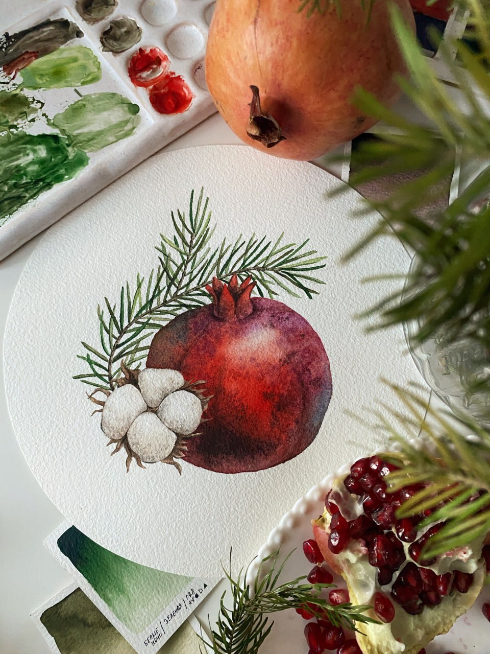Впечатляющая и удивительно нежная акварельная композиция с сочным гранатом, изящными листьями и пушистым хлопком.